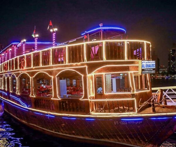 Set sail on an unforgettable journey along the iconic Dubai Creek aboard a traditional wooden dhow, offering stunning views of both historic and modern Dubai. As you glide through the serene waters, enjoy a delicious international buffet, live Tanura dance performances, and incredible views of Deira and Bur Dubai from the comfort of the fully air-conditioned lower deck or the open-air upper deck. Whether you’re looking to unwind or discover Dubai from a new perspective, this Dhow Cruise Dinner offers an unforgettable dining experience.