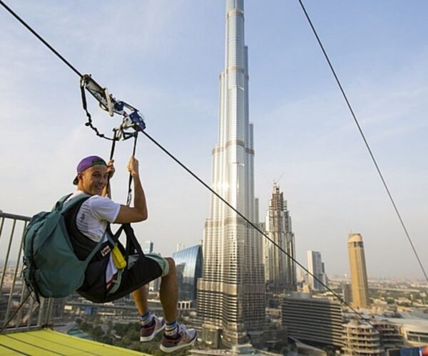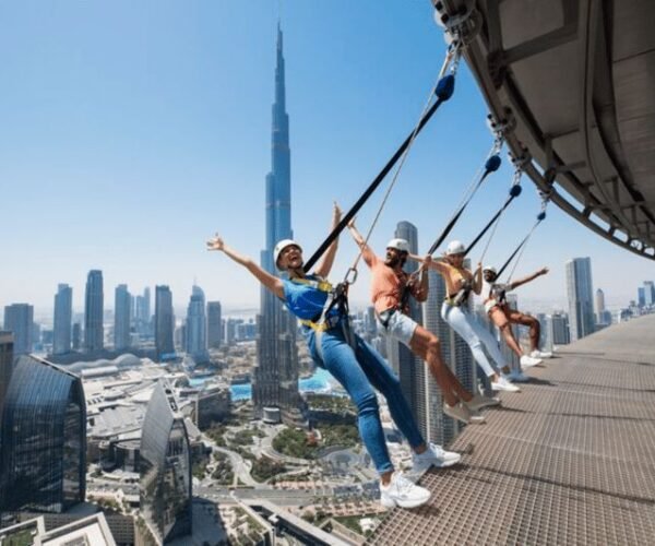 The Sky Views Edge Walk is an extreme urban experience that lets you walk around the outer rim of the Address Sky View building — without walls, windows, or protective barriers between you and the sky. Strapped to a safety harness and guided by experts, you’ll traverse a full circular ledge 219.5 meters high, gazing out over Downtown Dubai, the Burj Khalifa, and the urban panorama.